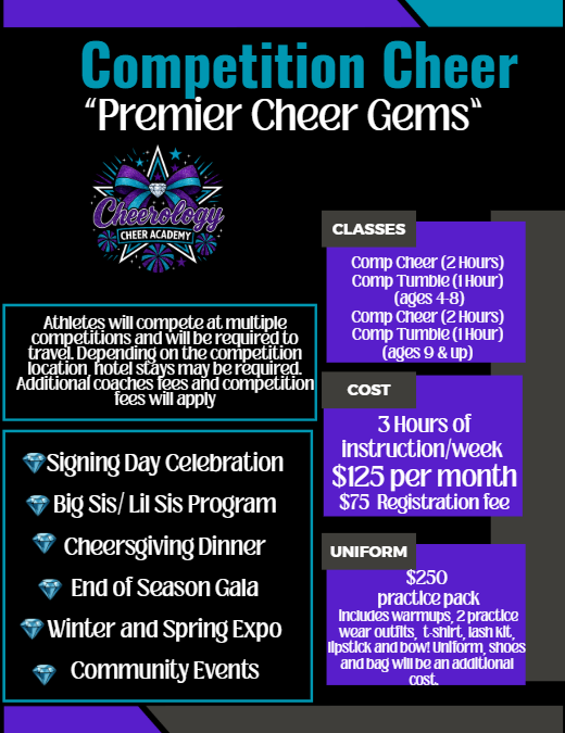 Get ready to shine brighter than ever! The Premier Cheer Gems program is designed for athletes who want to take their cheer skills to the next level through competition, teamwork, disciplined training, and unforgettable performance moments.